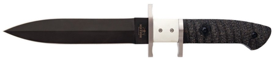 11.25" (28.58cm) overall. 6" (15.24cm) black finish double edge D2 tool steel drop point blade. Stainless guard. Full tang. White smooth bone and black G10 handle. Black leather belt sheath. Boxed.