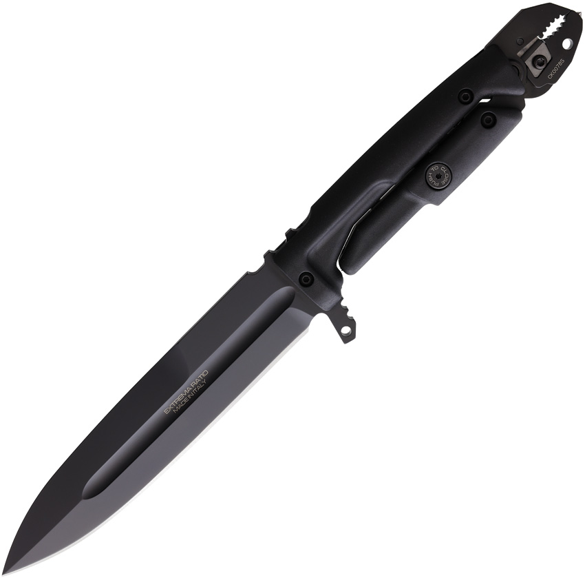 12.25" (31.12cm) overall. 6.5" (16.51cm) black MIL-C-13924 burnished Bohler N690 stainless spear point blade. Black Forprene handle. The handle is in two parts and works as the grip of a clamp placed at the end of the handle itself. The clamp can be used to cut wire-