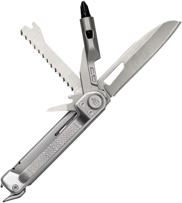 6.5" (16.51cm) overall. 3.63" (9.22cm) closed. Silver aluminum handle. Tools include: Awl l Bottle opener l Pocket clip l Pry bar l Saw blade l Small blade. Hammer I 2.5" extension bit driver with two-sided bit. Clam packed.