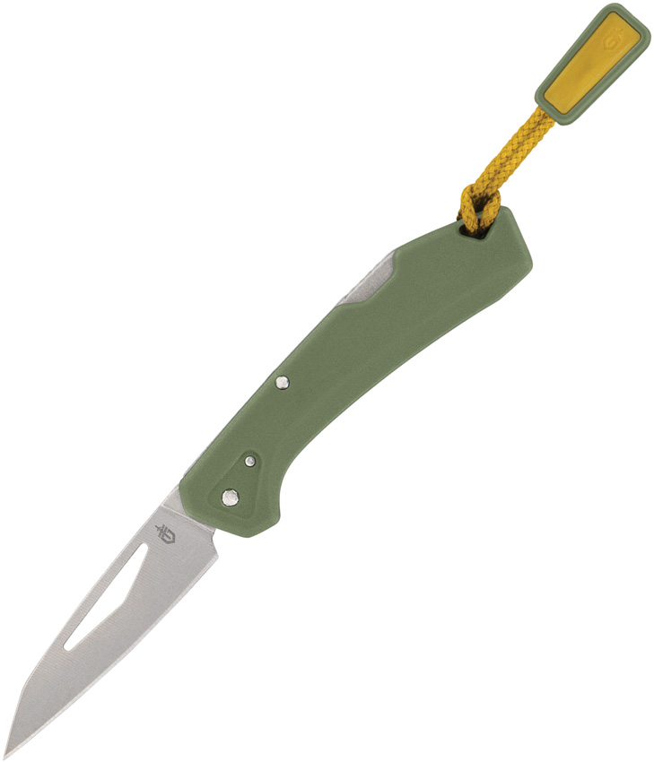 2.75" (6.99cm) closed. 1.75" (4.45cm) stonewash finish 440A stainless Wharncliffe blade. Green GFN handle. Lanyard hole. Thumb pull. English and French language packaging. Clam packed.